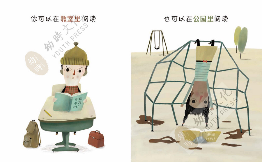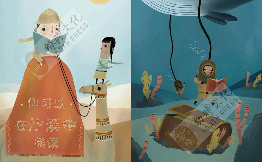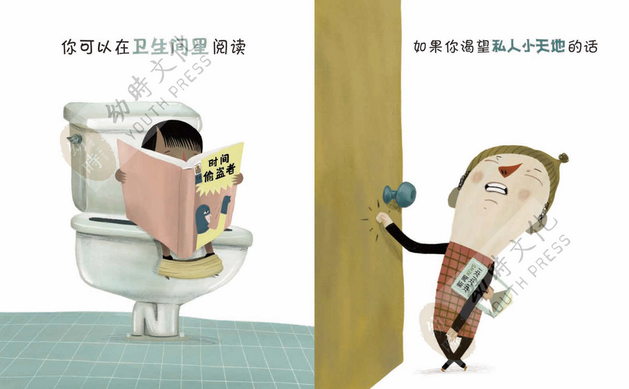 当然,阅读的自由还不止于此,在书中,你会发现我们常见的正襟危坐并不是唯一的阅读方式,其实你还可以有更多的选择:你可以坐着读,躺着读,倒立着读,当然,也可以骑着骆驼读……也不管你是在上厕所,开飞船,烹饪美食,还是在跳舞,在敲鼓,你也都可以阅读,而读的书也可以根据场景自由选择!