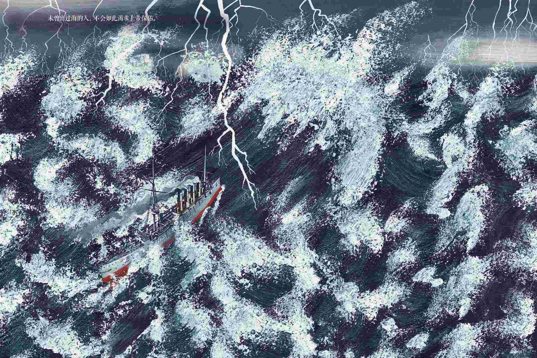 读过这部作品就会发现,托尔斯泰的诗中只有一处直接提到了船只,而贝奇科夫的每一幅图画上都有船,但这些船只并不是随意添加的。太阳升起时,行驶在海上的是15世纪发现了新大陆的“圣玛利亚号”卡拉维尔帆船,这样伟大的发现如阳光一般耀眼;波澜不定时,行驶在海上的是17世纪战争时代的英国红十字舰队和荷兰三色旗舰队,海上的波澜不仅是因海风而起,也是因海战而起;一排排海浪追赶时,小小的帆船和“大东方号”巨轮形成对比;而在暴风雨来临之时,只有俄罗斯舰队自豪与荣誉的象征——“瓦良格号”巡洋舰能继续航行;雨过天晴,风平浪静时,大大小小的船都在海面上,呈现出一派人与自然和谐的景象。